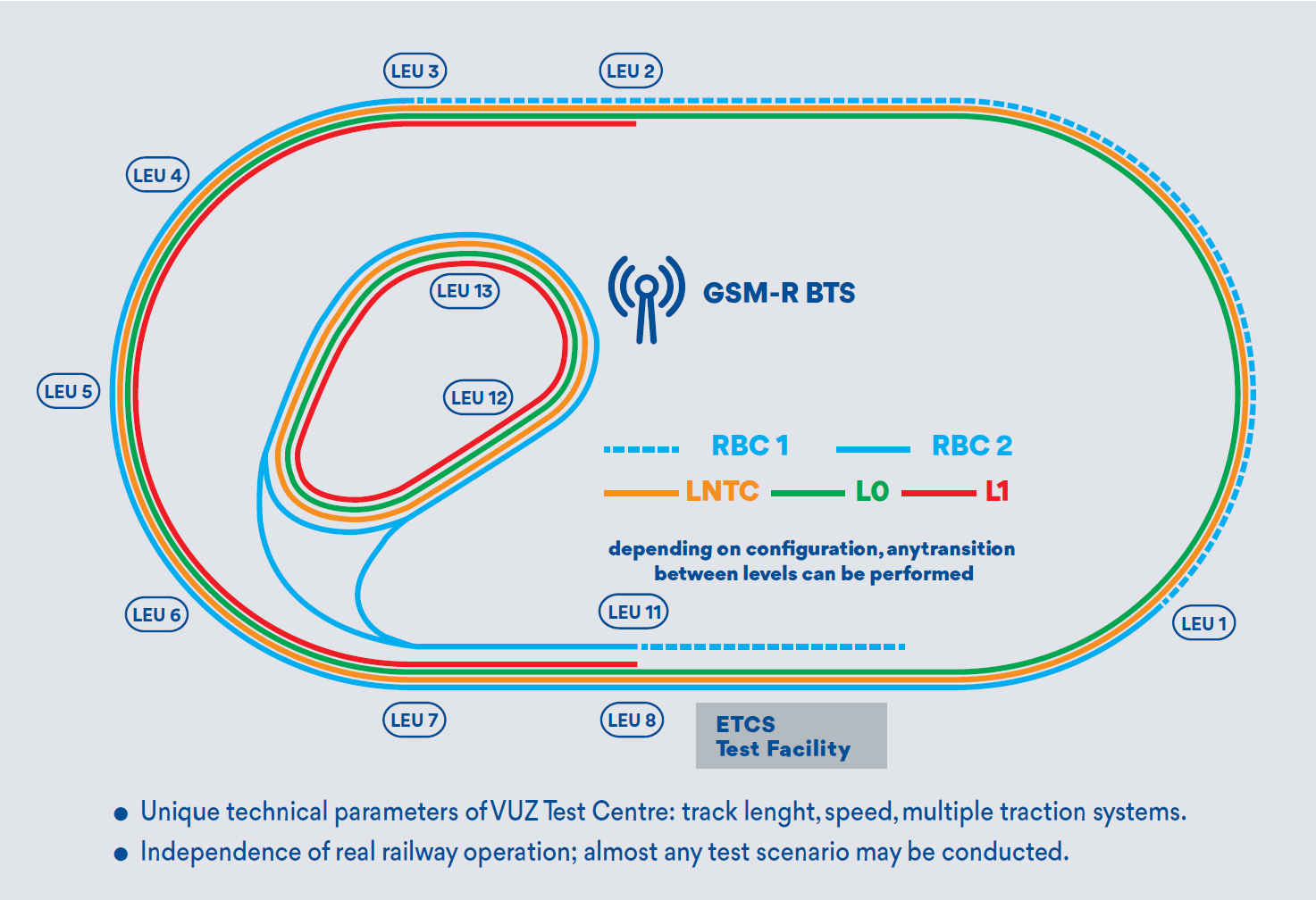 Das Prüfzentrum von VUZ bietet Einrichtungen für Tests von mit ETCS ausgerüsteten Fahrzeugen der Anwendungsebenen L0, LNTC, L1 und L2, einschließlich Kombinationen und Übergängen zwischen diesen. Dank zweier RBCs (Radio Block Center) können alle typischen Betriebsszenarien, die den mit ETCS ausgerüsteten Strecken in der Tschechischen Republik entsprechen, auf der Infrastruktur des Prüfzentrums von VUZ in Velim eingerichtet werden. Die installierten Balisen (sowohl fest als auch schaltbar) können zur Überprüfung der BTM-Funktion und der Odometriesysteme verwendet werden. Die Einrichtung ist bereit, Kompatibilitätstests oder ESC für die Tschechische Republik (ESC-CZ-01 und ESC-CZ-02 gemäß SŽDC PPD-2/2018) durchzuführen. Die Testinfrastruktur umfasst auch Mittel zur Überprüfung der korrekten Funktionalität der fahrzeugseitigen Einheiten des tschechischen nationalen Zugsicherungssystems LS.